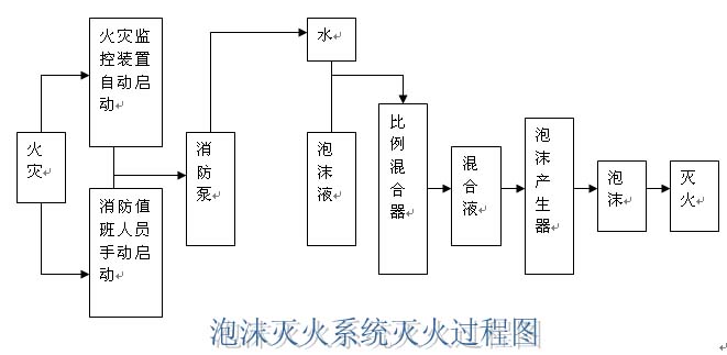 泡沫滅火系統(tǒng)由水源、泡沫消防泵、泡沫液儲罐、泡沫比例混合器、泡沫產(chǎn)生器、閥門、管道及其它附件組成。